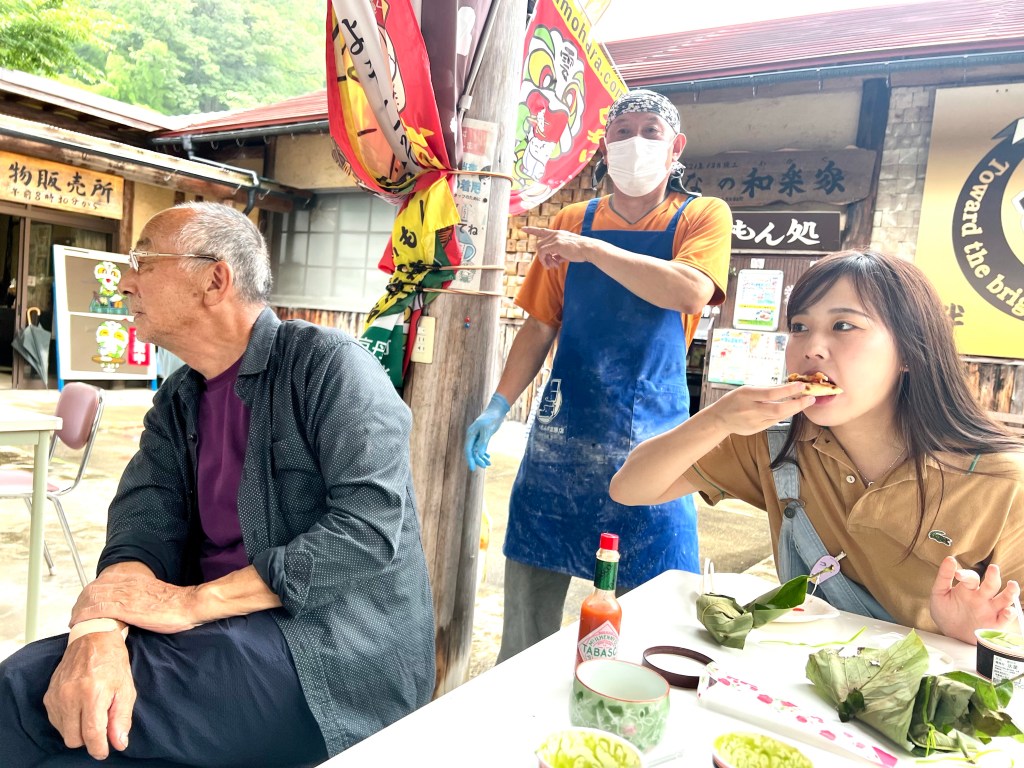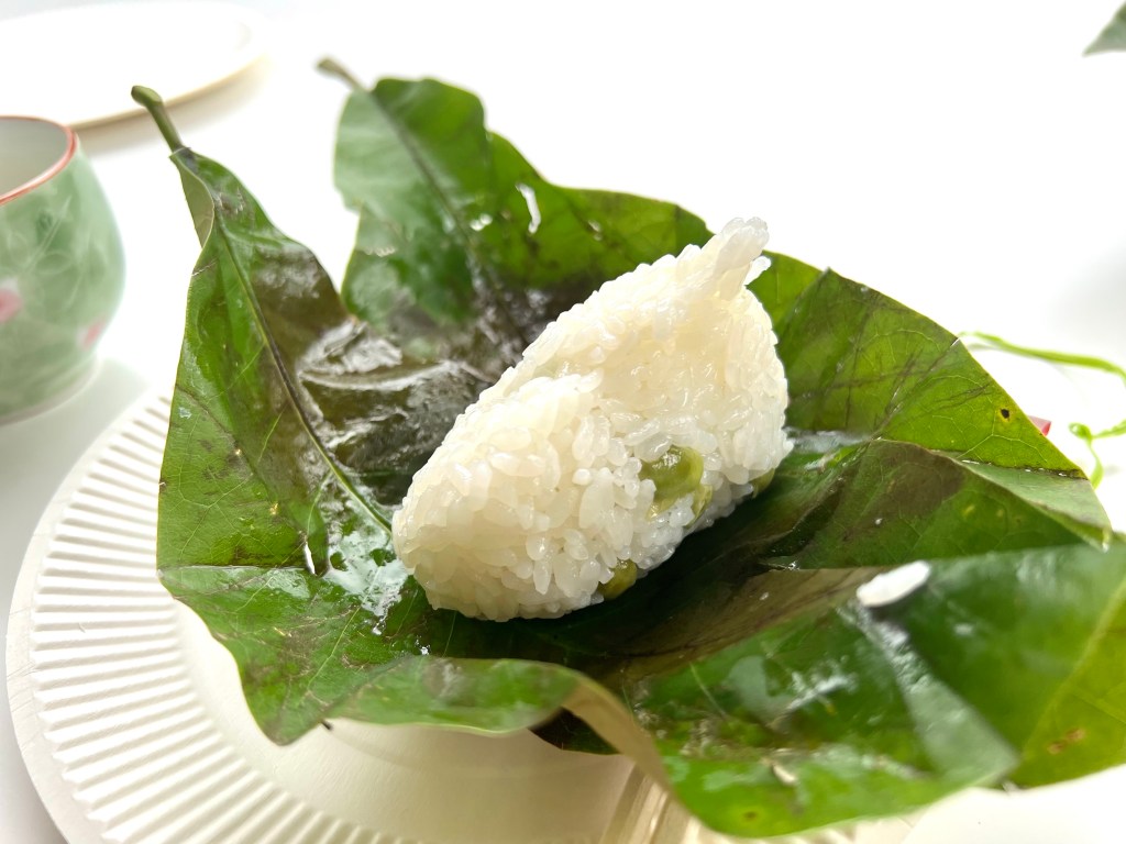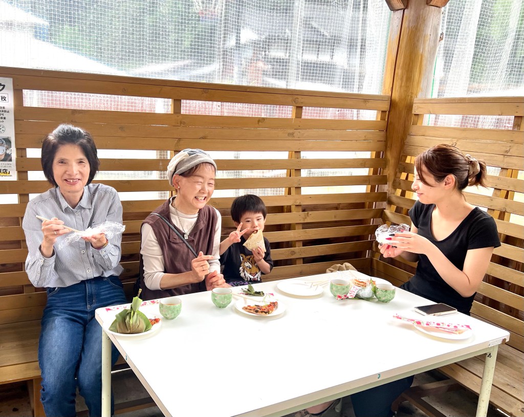 えんどう豆ごはんの朴葉おにぎりは、北陵うまいもん市「雲原店」(和楽家)の定食チームの皆さんにお世話になりました。参加してくれた子どもの中にはピザ作りの体験をしていただきました。