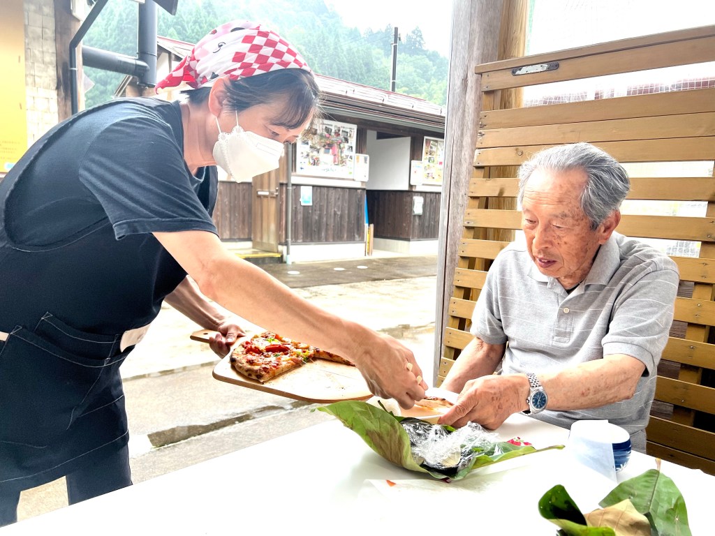 水車ひろばサロンが始まって 1 1年目。雲原名物の「石窯ピザ」と「えんどう豆ごはんの朴葉おにぎり」で昼食会をしました。「朴葉ごはんひさしぶりやわー」「ピザおかわり」と元気な声が水車ひろばに響きました。ピザ焼き職人の中村龍市さん、ピザ窯で焼方(自称 炎の番人)の曽根毅之さんにピザ焼に奮闘いただきました。