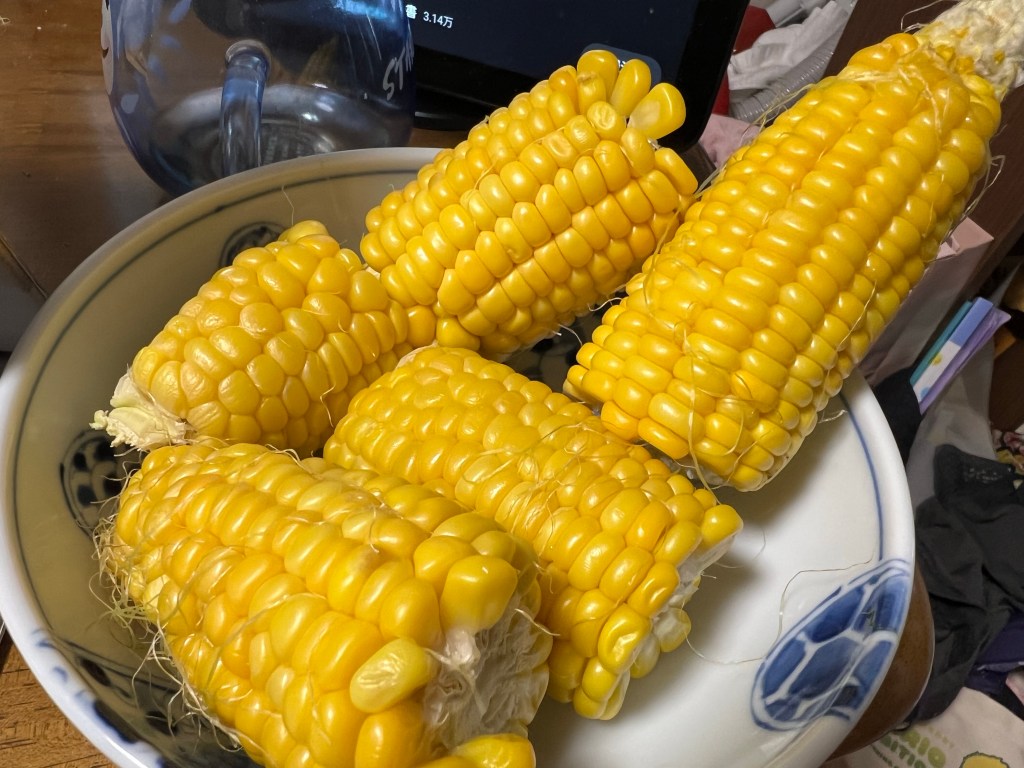 くもっち雲原農園は、ハゲ散らかしたボコボコのとうもろこししか出来ていない。順ちゃんが見かねて2本実の入ったのをくれた。