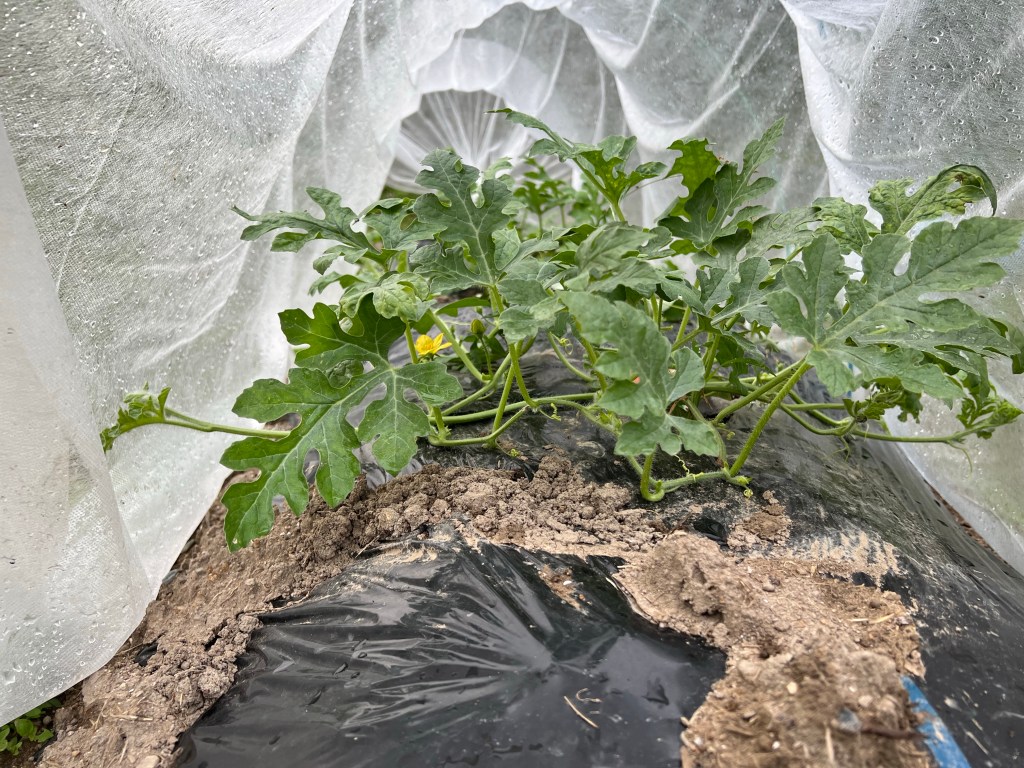 小さいラグビーボール状のスイカができる苗をコメリで発見。品名は特になく、札には「ラグビーボール型スイカ」と記載。1本では心許ないので3本定植。