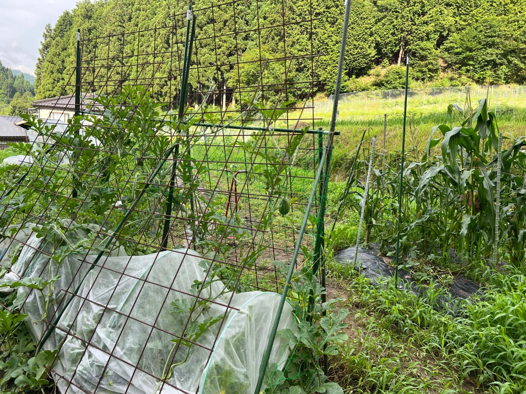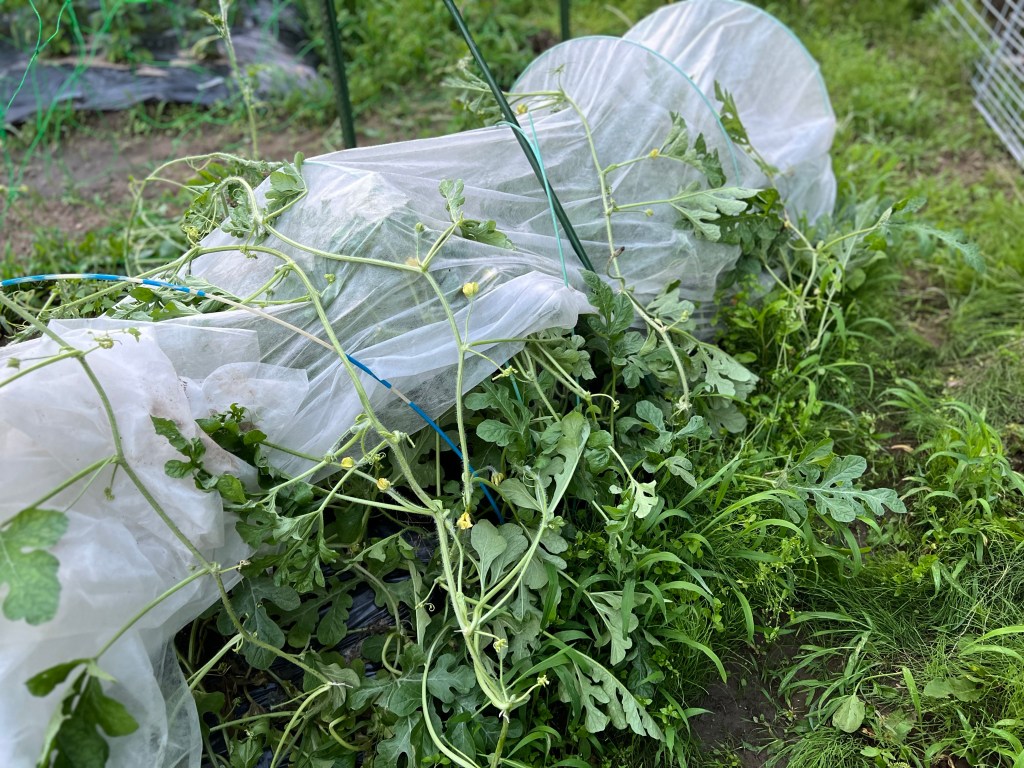 空中で栽培したく、糸井洋さんにその極意を聞き取り、不織布の下から顔を出したツルを、イボ竹支柱に取り付けたきゅうりネットに無理やり誘導。柔らかいので慎重に。失敗してちぎれたので結果敵芯となった。正しいかどうかは別にして、なんとかイメージ通りにスイカらしきものが現れる。嬉しい。