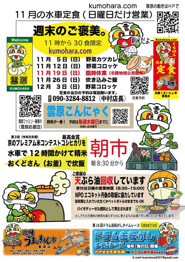 kumohara いがいと福知山 くもっち くもっち農園 くもっち雲原農園 こんにゃく さつまいも ふるさとレスキュー雲原 ふれあい広場 ドラム缶 ドラム缶転がしタイムレース 伝説 八幡神社 北陵うまいもん市「雲原店」 太鼓 桜御前 桜御膳 水車 水車定食 水車広場サロン 消防団 牛の皮 猫塚 神輿 祭 祭り 秋季点検 移住定住 笛 笛太鼓 西原亀三 酒呑童子 雲原 雲原こんにゃく 雲原ファミリー 雲原分団 雲原川 雲原村総合案内所 雲原砂防 雲原砂防イベント 雲原福祉推進協議会 雲原自治会 鬼伝説 鬼童丸 龍雲寺