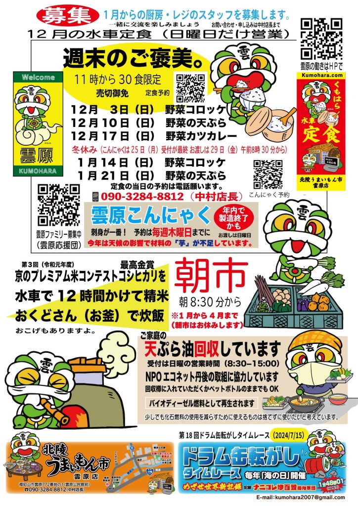 なお、1月からの厨房とレジのスタッフを大募集しております。ご一緒に地域内外の皆様との交流を楽しみたいと思いますのでよろしくお願いします。お問い合わせなどは中村店長(📱090-3284-8812)に連絡をお願いします。