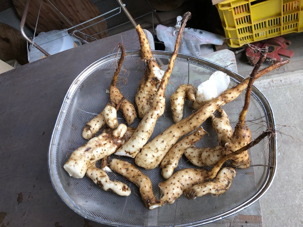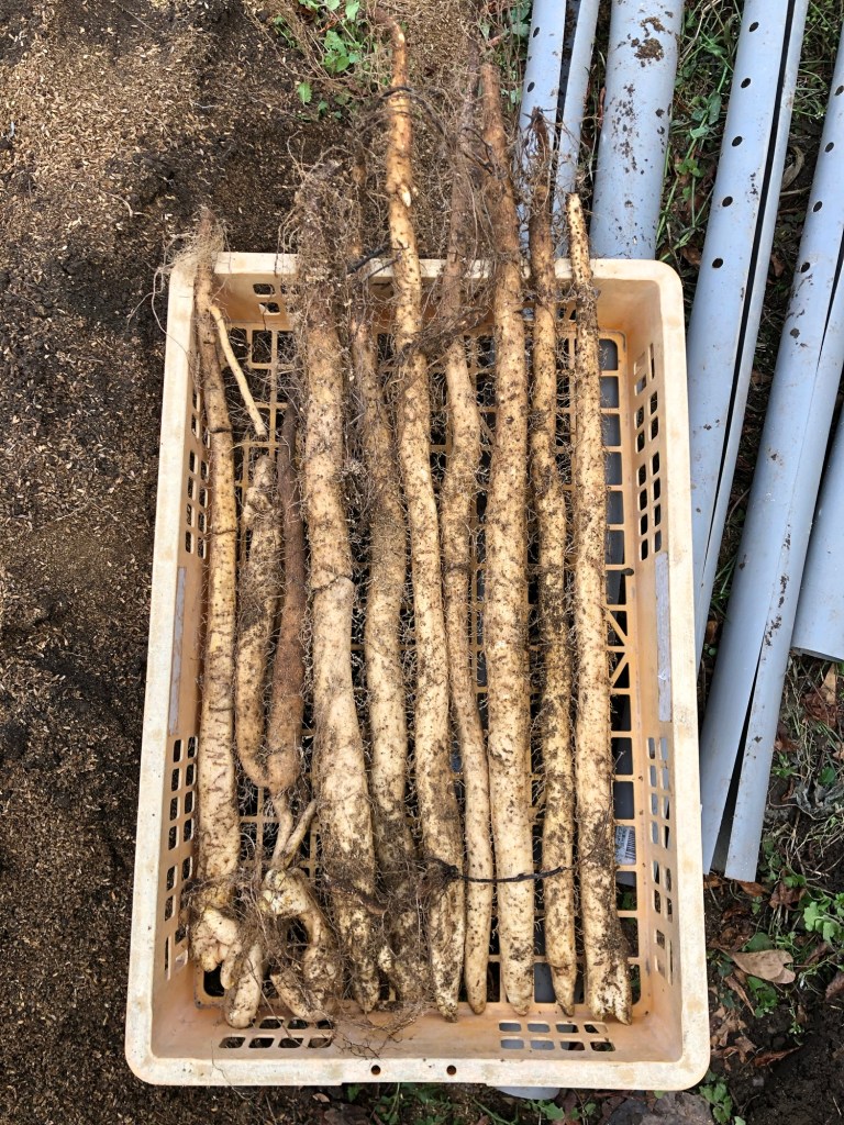 方や短形自然薯、これは地下にドーンと入っているものと勘違いし、周辺をまず地下1メートルくらい掘った上でいよいよ茎下から掘るとーーー 変形の短い自然薯が石などが多いためさらに変形した形で現れました😭 次年は波板を使うこととしております。