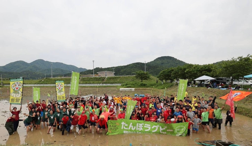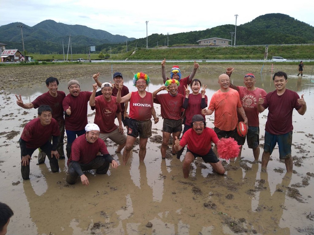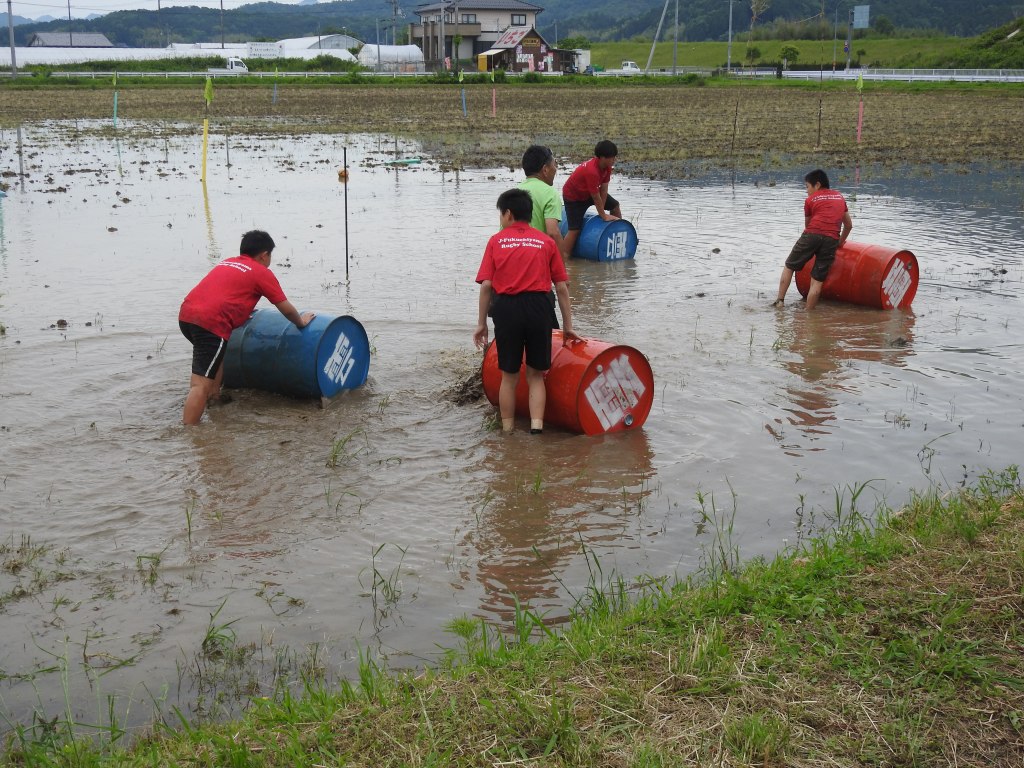 ホンマにここでするのか 大会会場のたんぼは、あらおこしに水がはってある状態 間違えなくにえこむ 田植え経験はある ラグビー経験はない