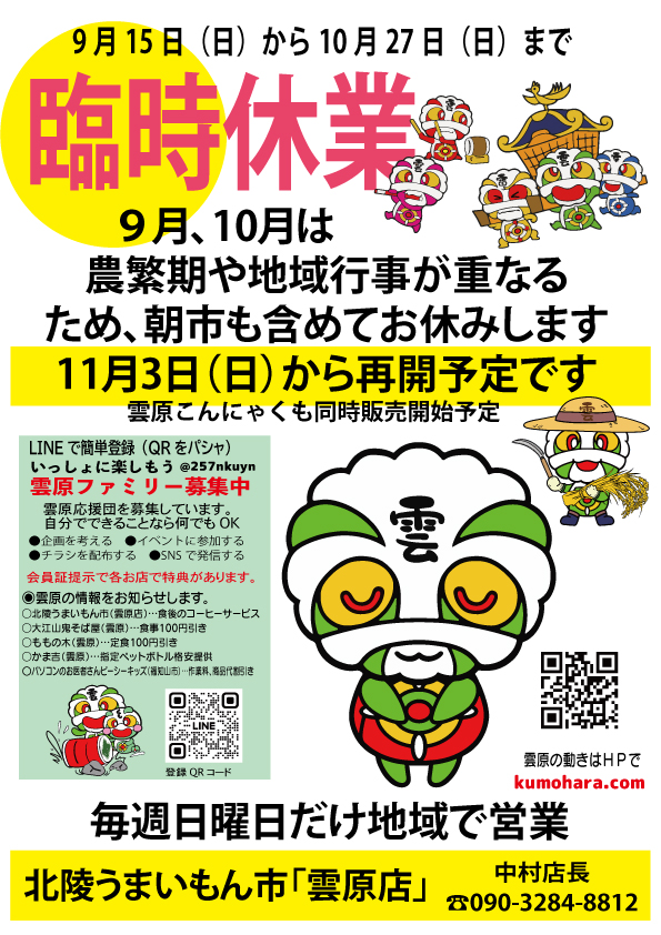 11月3日(日)から再開予定です。(雲原こんにゃくも同時に販売予定です。)