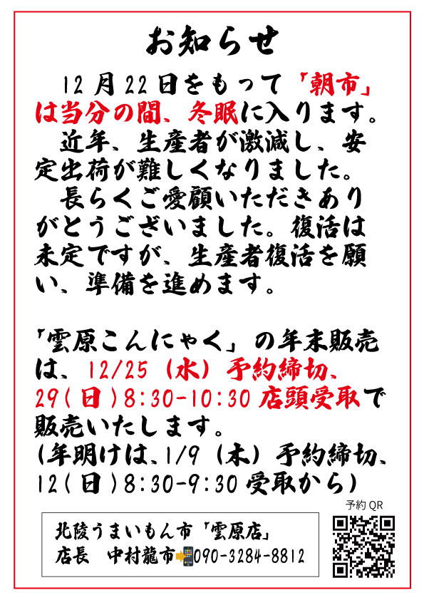 なお、恒例の「雲原こんにゃく」の年末販売は予約制で行います。 12月25日(水)までにご予約の上、12月29日(日)の朝8時30分から10時30分の間に受け取りにお越しください。(郵送も可能です。) https://ws.formzu.net/fgen/S24477592/