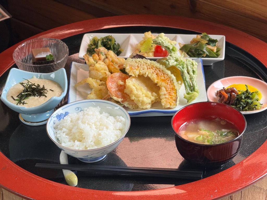 本日の水車定食「野菜の天ぷら」は、雲原の旬素材8品目:タラの芽・たけのこ・椎茸・さつまいも・かぼちゃ・にんじん・玉ねぎ・かき揚げ