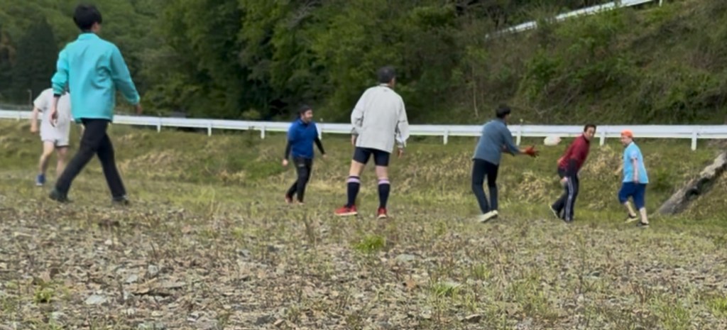 雲原・くもっち(雲原・くもっち田んぼラグビー部)は、草と鹿のフンに囲まれたドラム缶会場にて、2時間のみっちり追い切り練習を敢行!練習終了後のこの様子が全てを物語る。