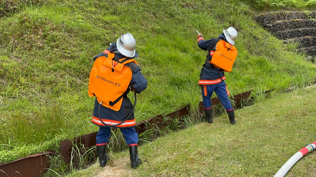 訓練中、夜久野分団が使用していた背負い型ミニ消火装置「ジェットシューター」が注目を集めました。機動性に優れ、狭い場所やホースが届かないエリアでも有効に消火活動が可能で、特に残火処理の局面でその力を発揮。