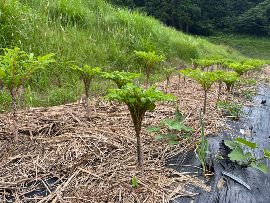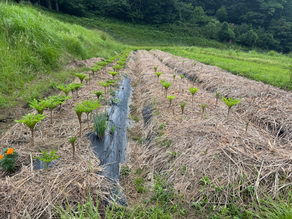 この夜に植えたこんにゃく芋たちは、今、見事に芽を出し、元気に育っています。(向かって左側の畝)