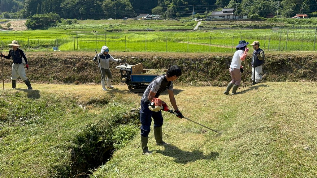 地元の方々は多彩な草刈りマシーンを持ち寄ってくださり、まるで農機具の展示会状態。おかげで作業はどんどんはかどりました。
