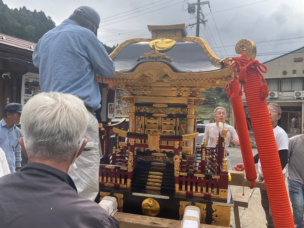 📸 作業を終えたお神輿と公民館前水車広場