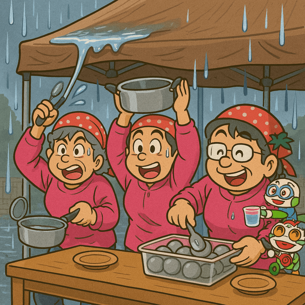 と思いきや 大雨でテントが雨漏りするというハプニングが発生!それでもバケツや鍋で水を受け止めながら、笑顔で販売を続けました。