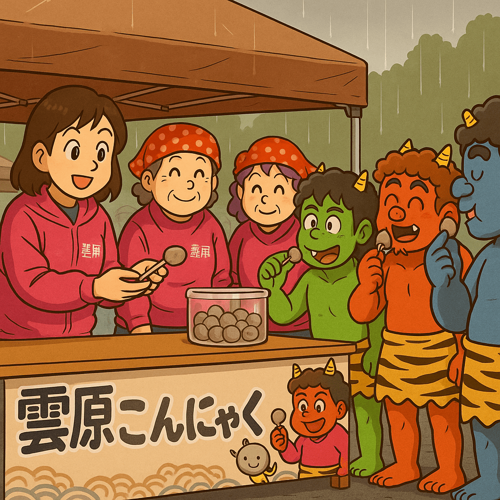鬼の行列にも試食をふるまい、「こんにゃくの特有の臭みが全くない」「ぷるんとして美味しい!」と大好評。