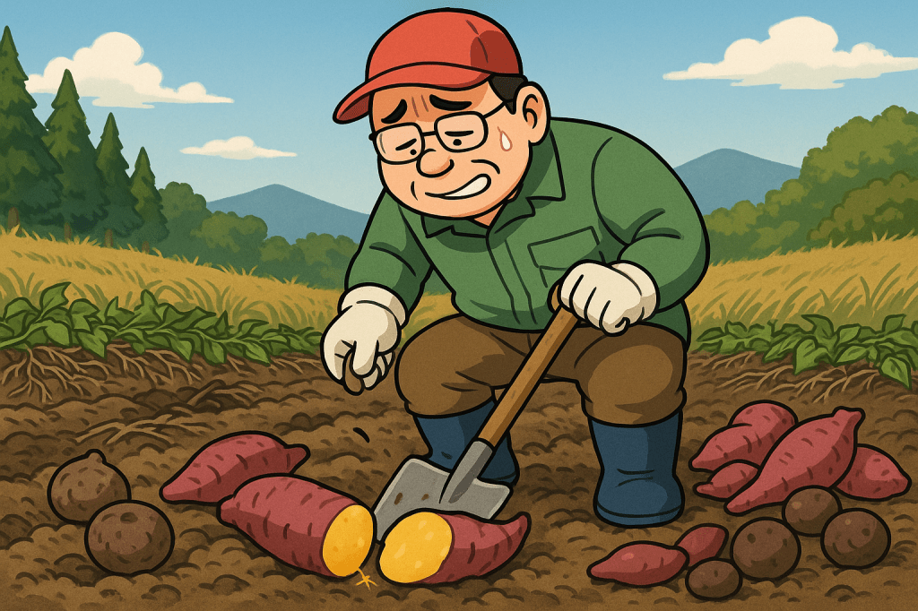 結局スコップ一本で挑み、ときには大きく育った芋を真っ二つにしてしまう悲しい瞬間も……。