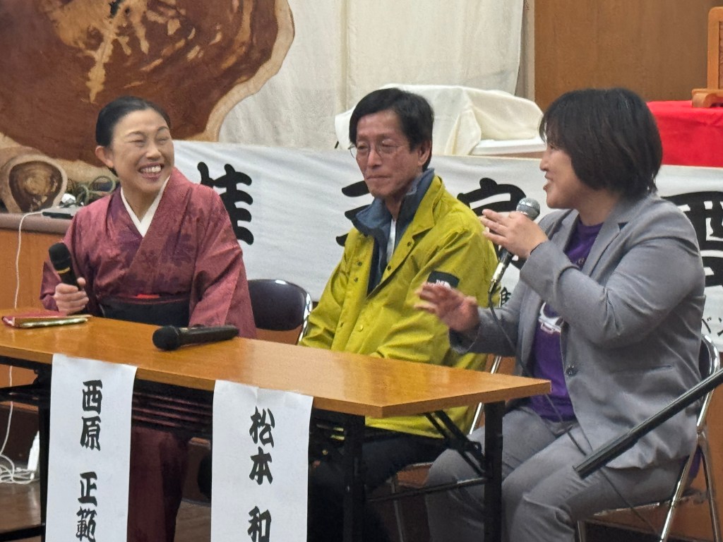 登壇したのは、進行役の桂三扇さん、西原正範委員長、そして動画講師の松本和子さんの3名です。(YouTubeもご覧いただけます。)